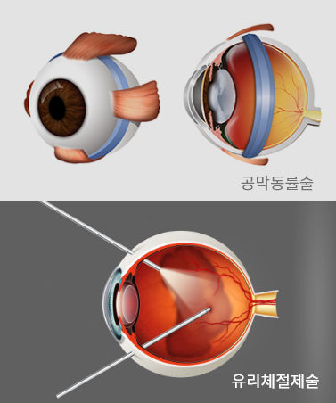 망막박리의 범위가 넓은 경우에는 공막동률술이나 유리체절제술 등 수술적 치료가 필요하게됩니다.